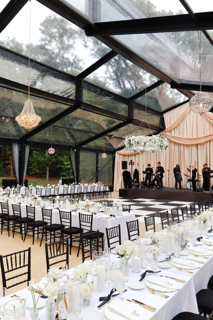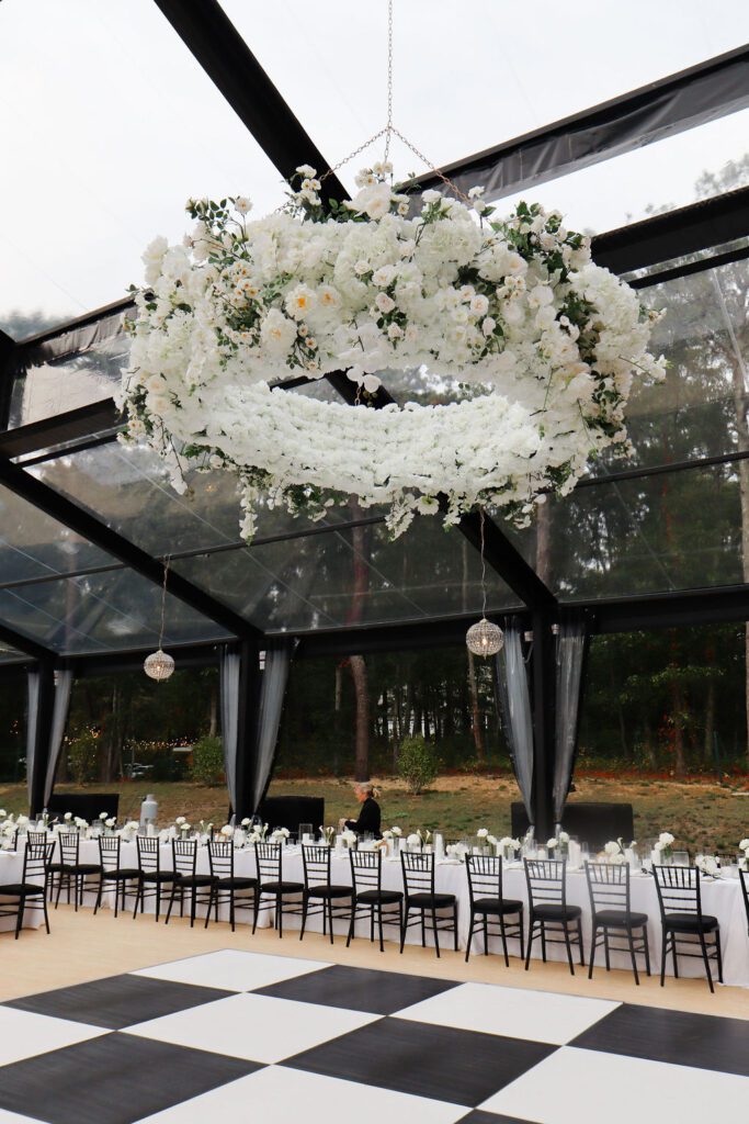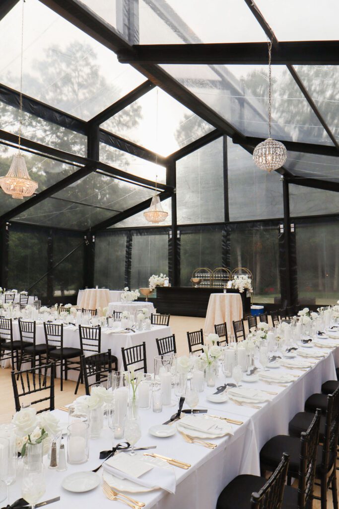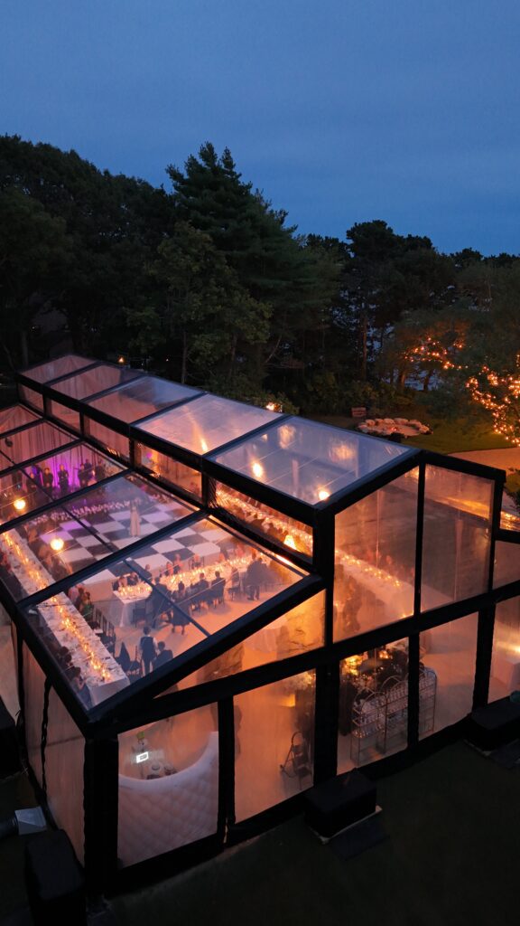 As evening set in, the conservatory tent transformed. The glow from overhead lighting danced against the transparent walls, creating a soft shimmer that made the entire space feel magical.