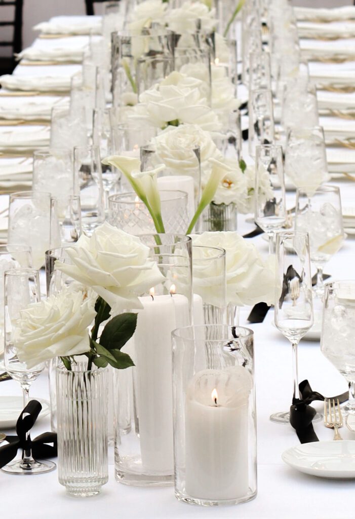 - Botanical-forward floral installations that climbed upward like a true greenhouse