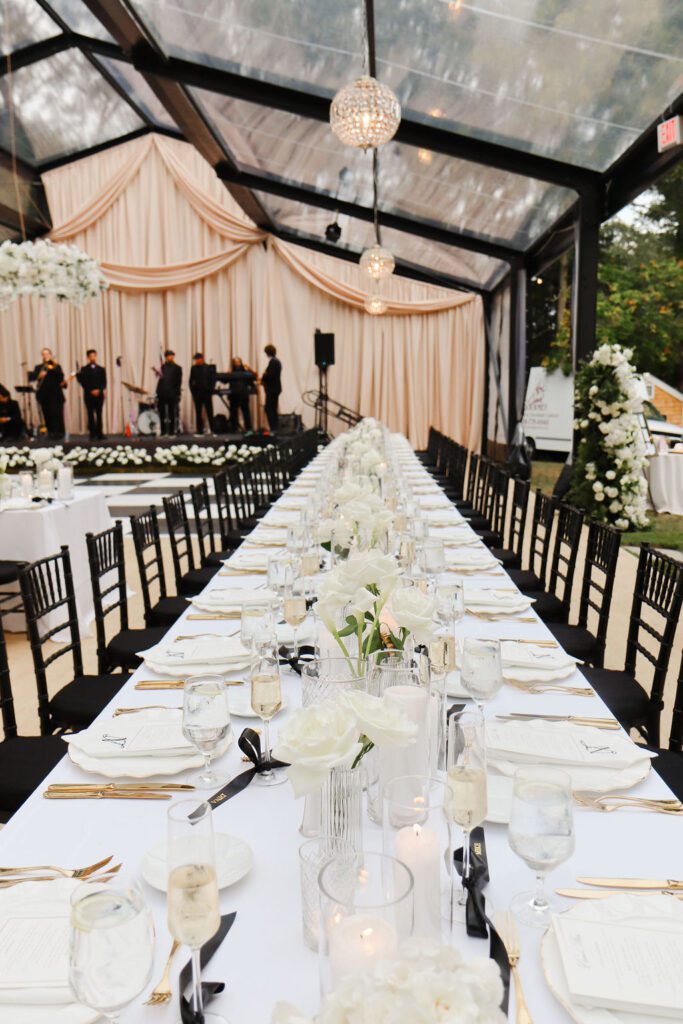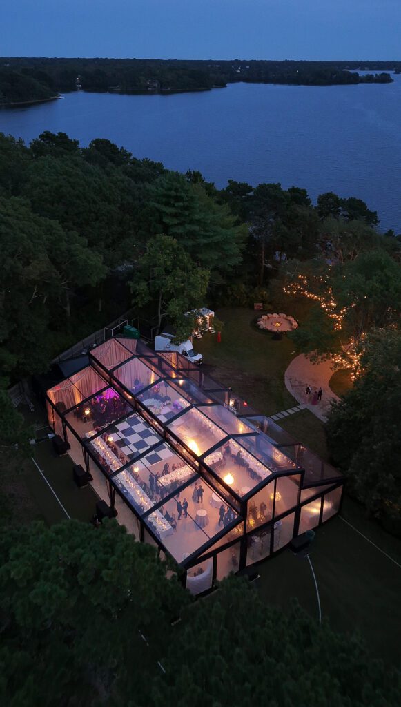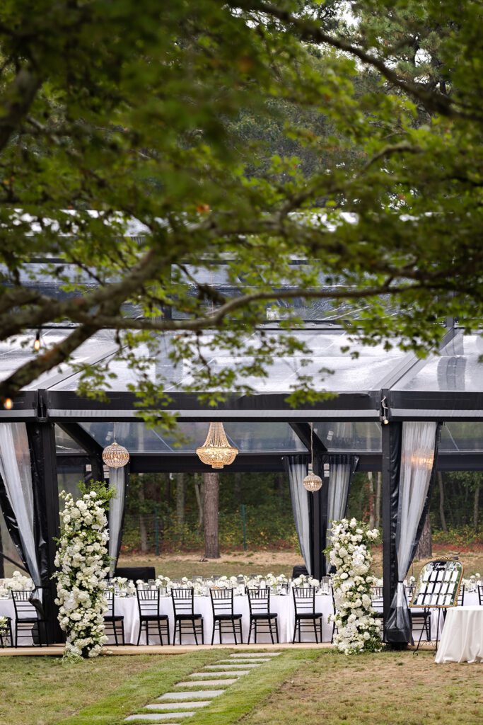 Rather than a traditional tent, Tia & Nick chose a conservatory-inspired structure — a transparent, architectural tent that allowed the surrounding oak trees, soft coastal breezes, and early-autumn Cape Cod light to become part of the experience.